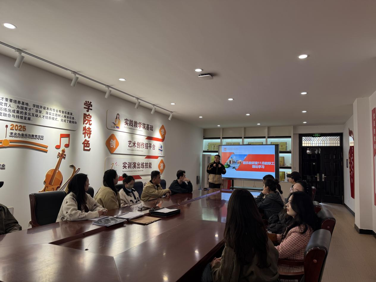 (图文/佘怡霏)为进一步强化器乐教师队伍的师德素养与职业规范,建立健全师德师风建设长效机制,器乐教研室于11月11日16点在音乐与教育学院音219办公室召开了教职工理论学习会议。本次会议由器乐教研室刘磊主任主持,全体器乐教师参加。