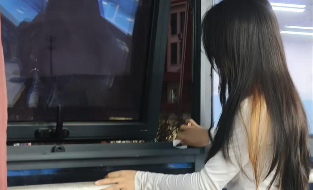 活动当天,志愿者们分工明确,各司其职。一名女生专注于楼道窗框的清洁,她仔细地擦拭着玻璃与边框,拂去积尘,让原本略显灰蒙的窗户重新变得明亮。与此同时,另一名男生则在消防器材旁,认真检查着灭火器箱体,并清点整理着其中的设备。他们的动作安静而专注,透着一份沉静的认真。