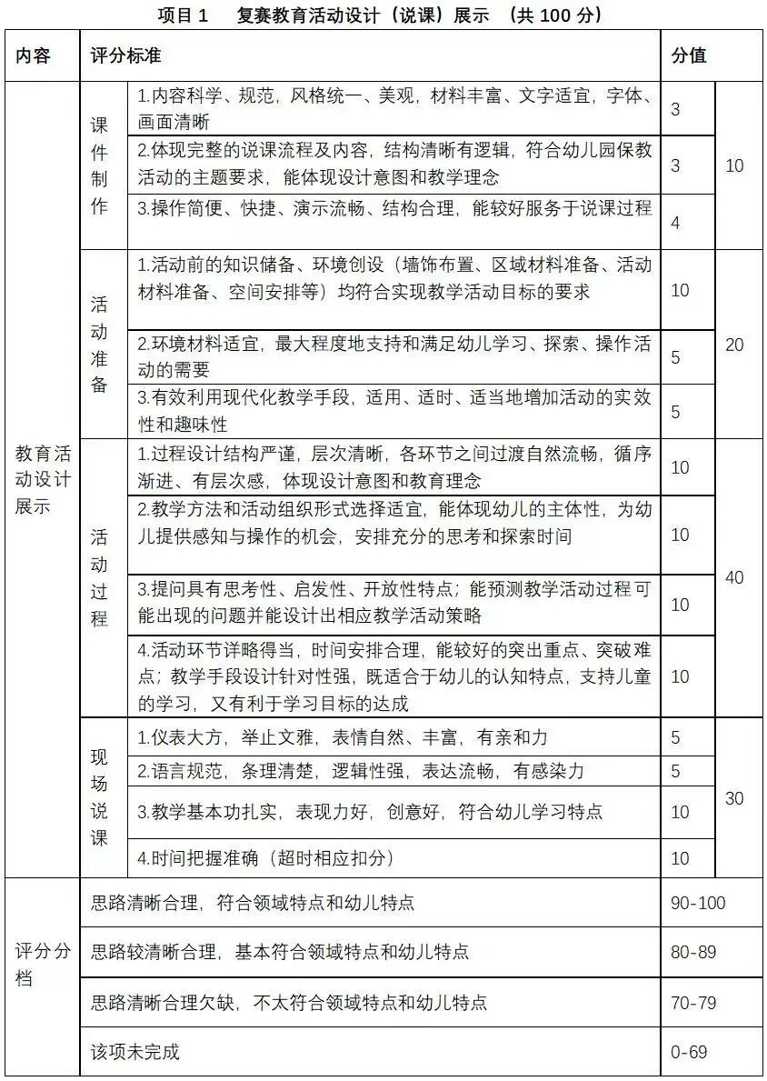选手根据《3-6岁儿童学习与发展指南》、《幼儿园教育指导纲要》等精神,结合自身专业能力和兴趣,自备一节幼儿园教育活动设计说课(复赛)及微型课展示(决赛),以及学前教育专业技能(儿歌弹唱、表演唱、舞蹈、讲故事、简笔画等)展示(决赛)。