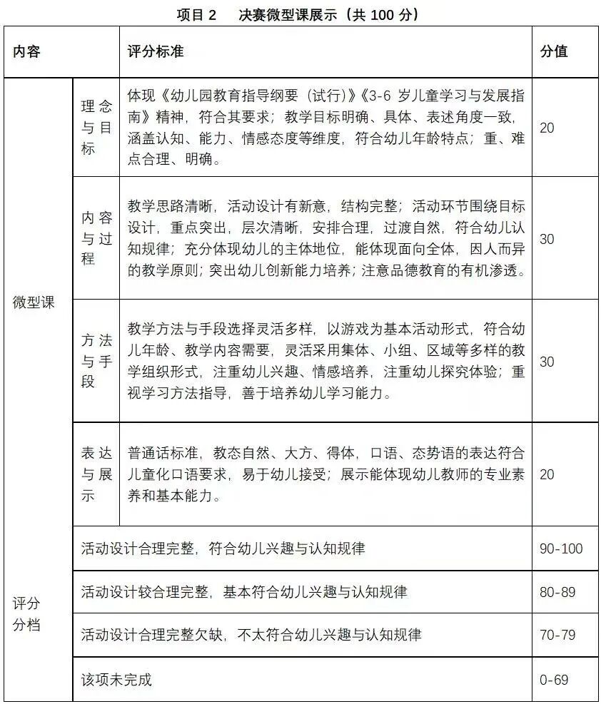 3.决赛:决赛以微型课+才艺展示的方式进行,时间为4月21日,地点在音乐厅。参加决赛选手于4月20日12:00前将修改后的教学设计及教学PPT发送至邮箱jiejingsmile@163.com,并将纸质版教学设计三份呈报至幼儿园YJ-203办公室陈杰静老师处。决赛分为两个环节进行:第一环节为教育活动展示(微型课)环节,满分100分,占总分比例70%,时长不超过8分钟。第二个环节为才艺展示环节(除钢琴外,一切材料自备),满分100分,占总分比例30%,才艺展示时长不超过4分钟。决赛总成绩=教育活动展示成绩(微型课)×70%+才艺展示×30%,根据选手的总成绩排名情况,评选出一等奖1名,二等奖2名,三等奖5名,优秀奖若干名。