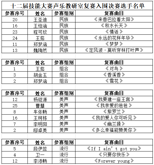 本次大赛严格遵循公开、公正、公平原则,经前期报名、初赛选拔、复赛演唱,一批基本功扎实、舞台表现优异的选手成功入围决赛。晋级决赛的选手名单如下: