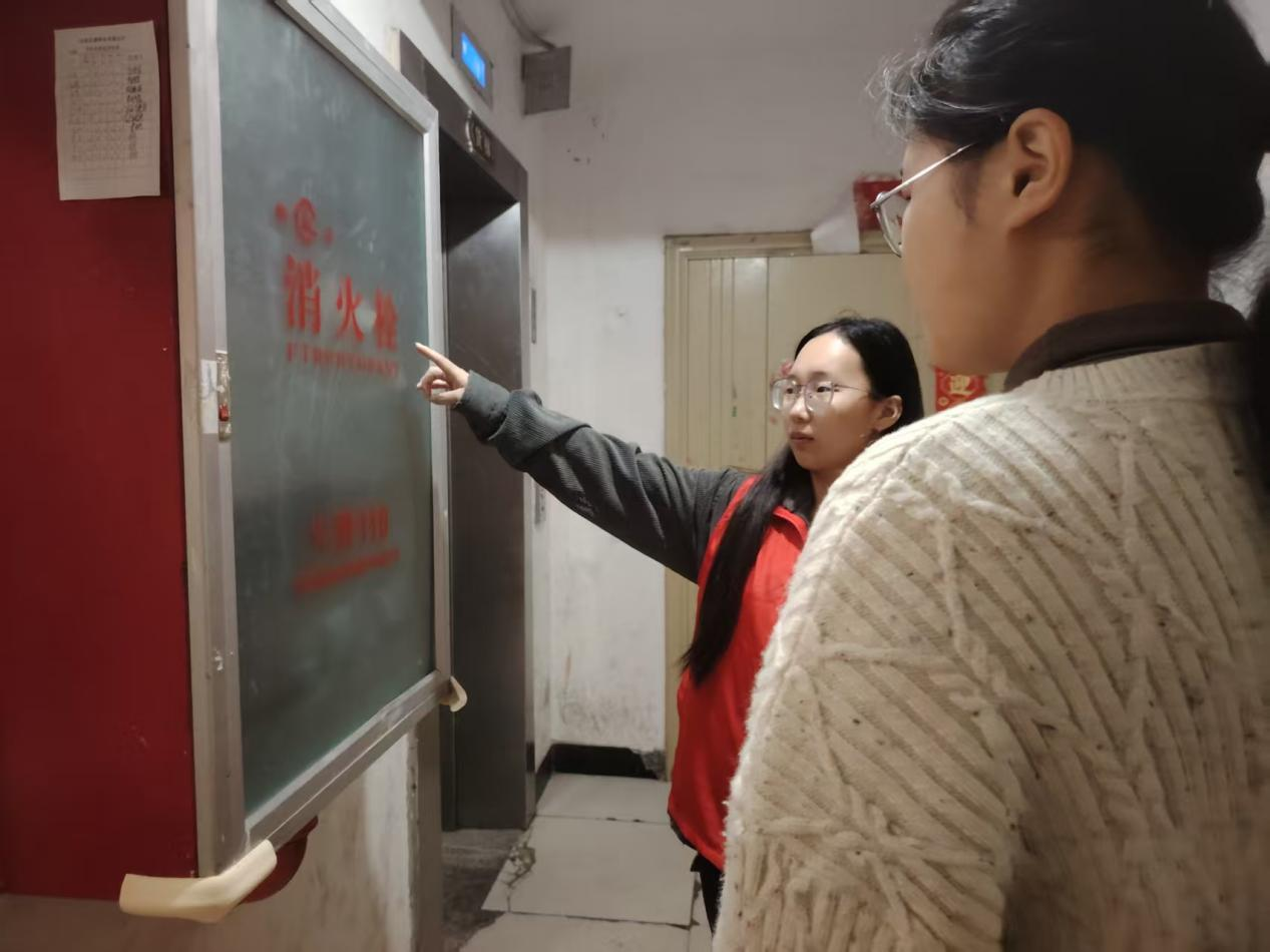 身着艳红色马甲的志愿者正站在楼道内,耐心细致地向周围的居民讲解消防安全的重要知识,场面生动展现了志愿者在社区服务中的细致与热情,不仅向居民传递了安全知识,还流露出志愿活动中的温馨与关怀,充分体现了志愿者以实际行动服务社区、守护居民安全的细节与用心。