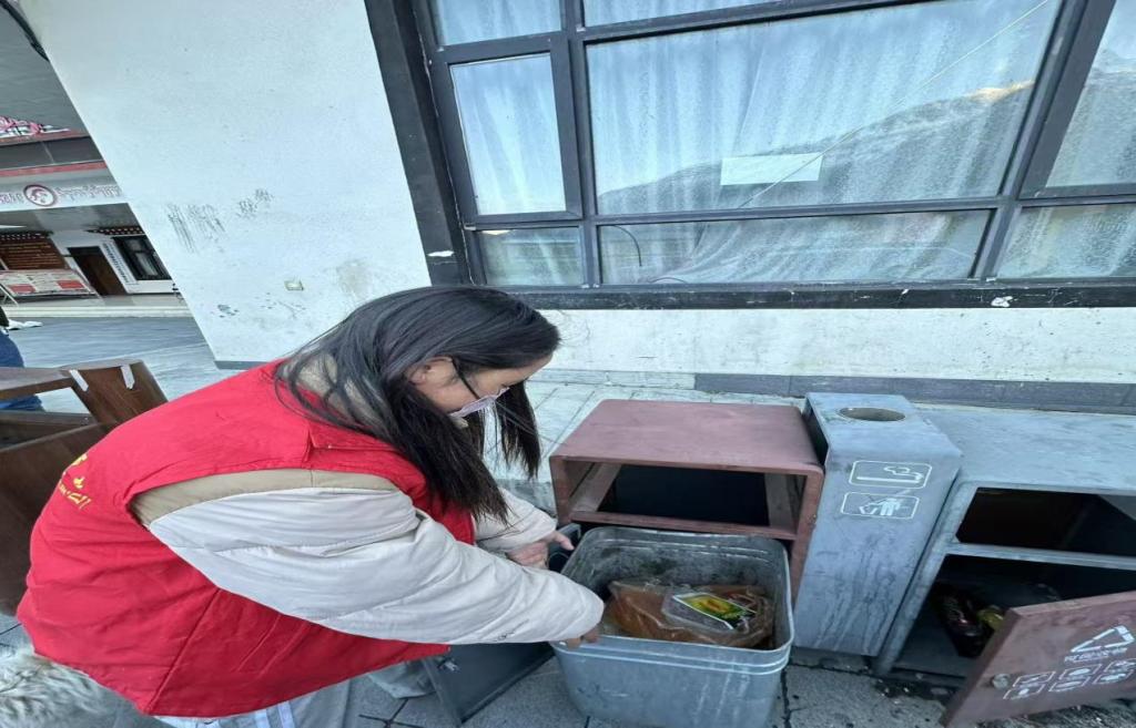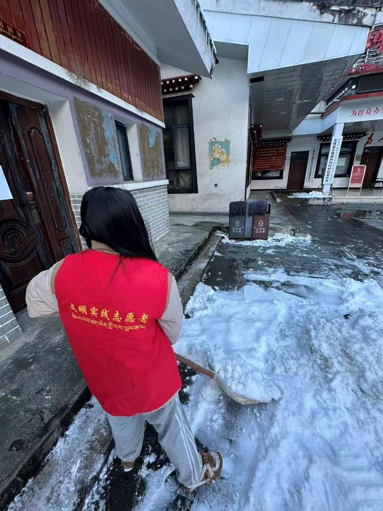 活动当天,巴桑普尺同学来到指定的乡村和社区集合点,迅速投入到清扫工作中。在乡村道路上,她仔细整理垃圾桶内的杂物,不放过任何一处卫生死角;面对路面残留的积雪与薄冰,她手持铁锹耐心铲除,保障行人出行安全。尽管天气寒冷,但她的热情丝毫未减,干劲十足。在社区里,她不仅清理了街道上的垃圾与积雪,还对墙壁、宣传栏等公共区域进行了细致清洁。