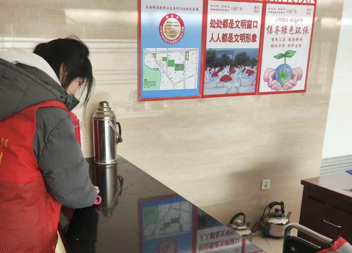 在社区服务站的便民物资柜前,她仔细整理各类便民物资,将零散的物品分类归置、整齐摆放,让居民能更便捷地取用所需物资。随后,她又拿起抹布,认真擦拭社区服务中心的前台桌面,不放过任何一处污渍,确保公共服务区域干净整洁,为居民营造舒适的办事环境。