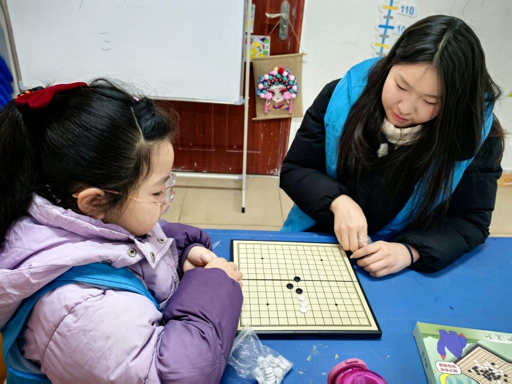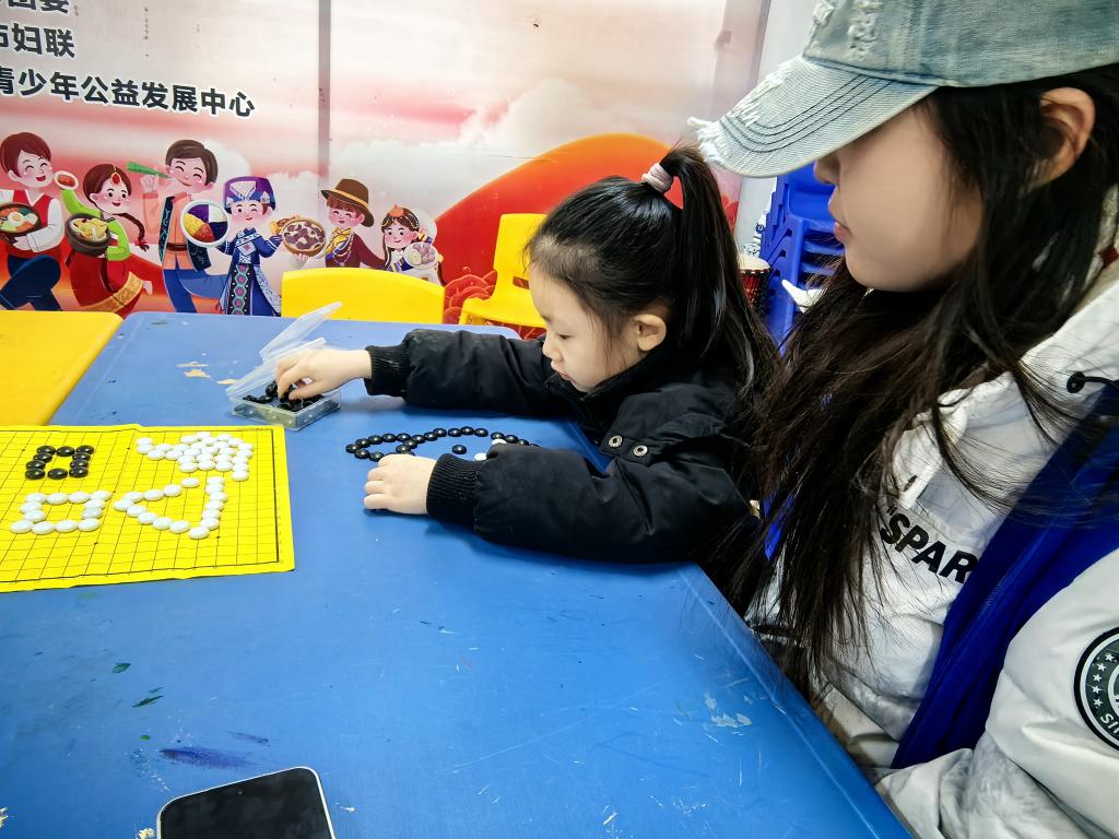 下午,志愿者发挥学前教育专业特长,为孩子们耐心辅导课后作业,细致讲解知识点、解决学习难题。随后开展五子棋对弈、图形认知等趣味游戏,在轻松互动中锻炼孩子们的思维能力与专注力,活动室里满是欢声笑语。