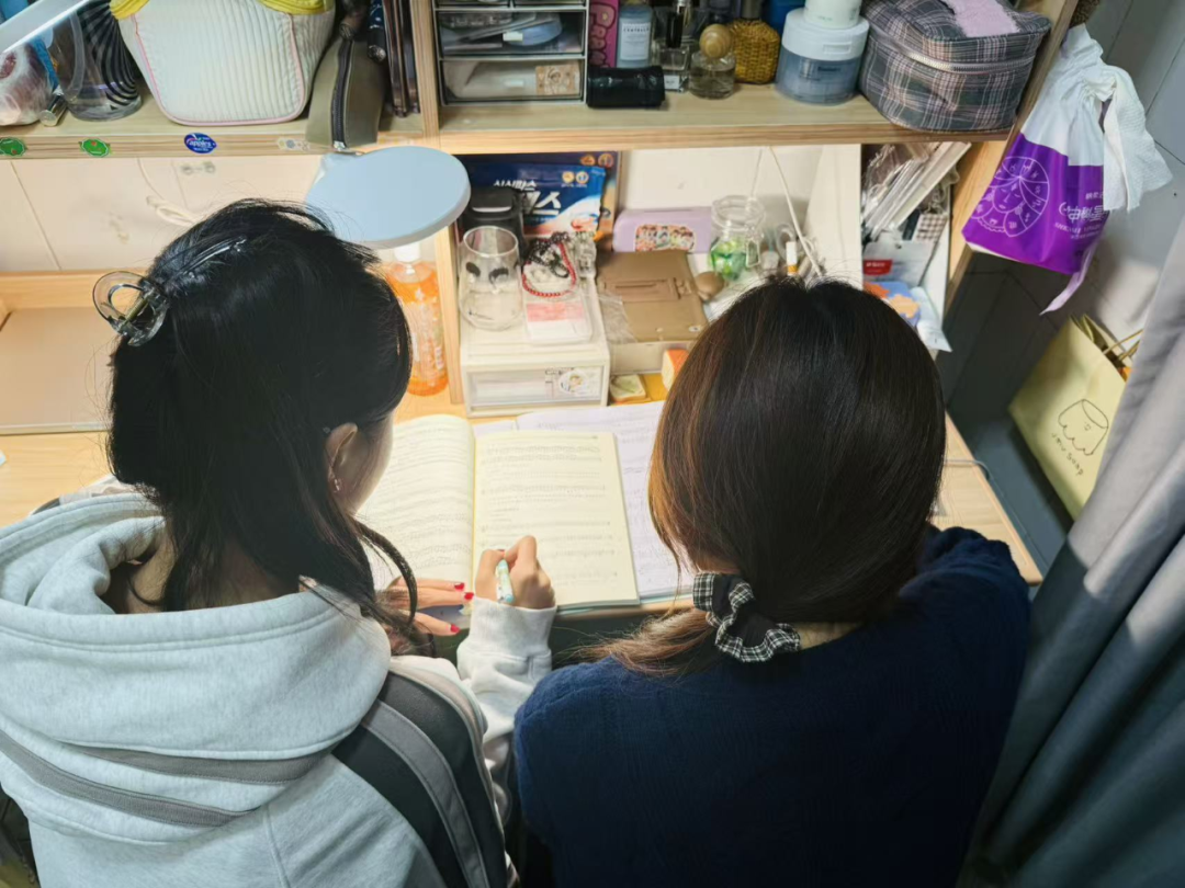 在宿舍的书桌前,两位同学正凑在一起,专注地探讨着学习问题。这样的学习互助场景,是校园里“我为同学做实事”的另一种生动体现。在备考的压力下,她们选择结伴学习、互相答疑,将个人的知识分享转化为共同的进步动力,让学习之路不再孤单,也让彼此的知识储备在互助中不断丰富。